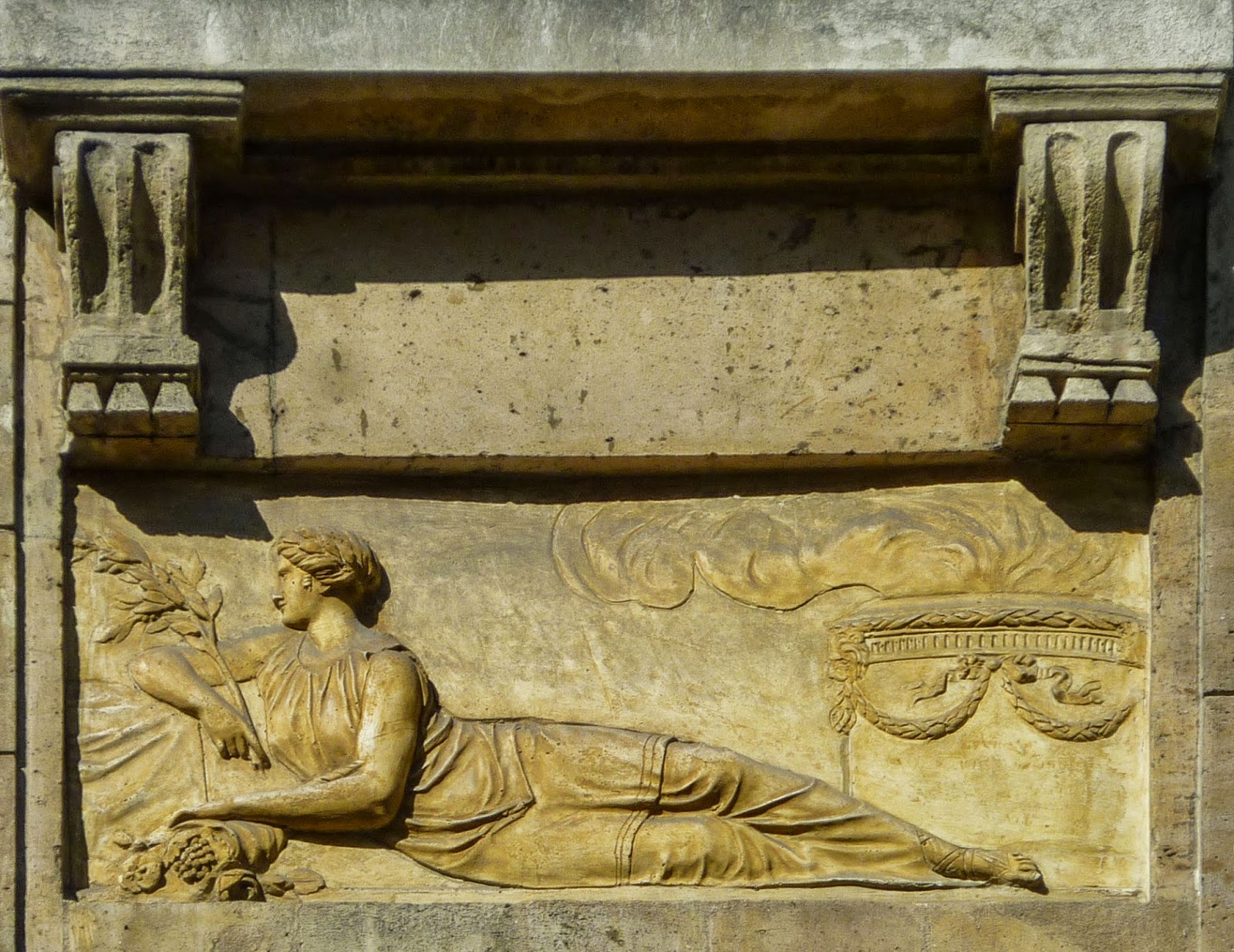 Pour les reliefs du 16 rue Debelleyme, celui d'une femme tenant dans ses bras ce qui me semble etre un enfant pourrait etre une allégorie du toucher. Son autre main laisse tomber des roses ou des fleurs.